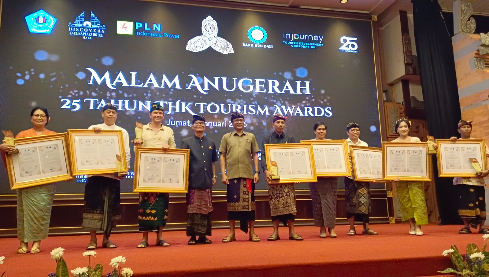 Balitopik.com, BALI – Malam puncak peringatan Jubileum Perak, 25 tahun Tri Hita Karana (THK) Awards berlangsung megah di di Discovery Kartika Plaza Hotel, Badung Bali, Jumat (9/1/2026), malam.