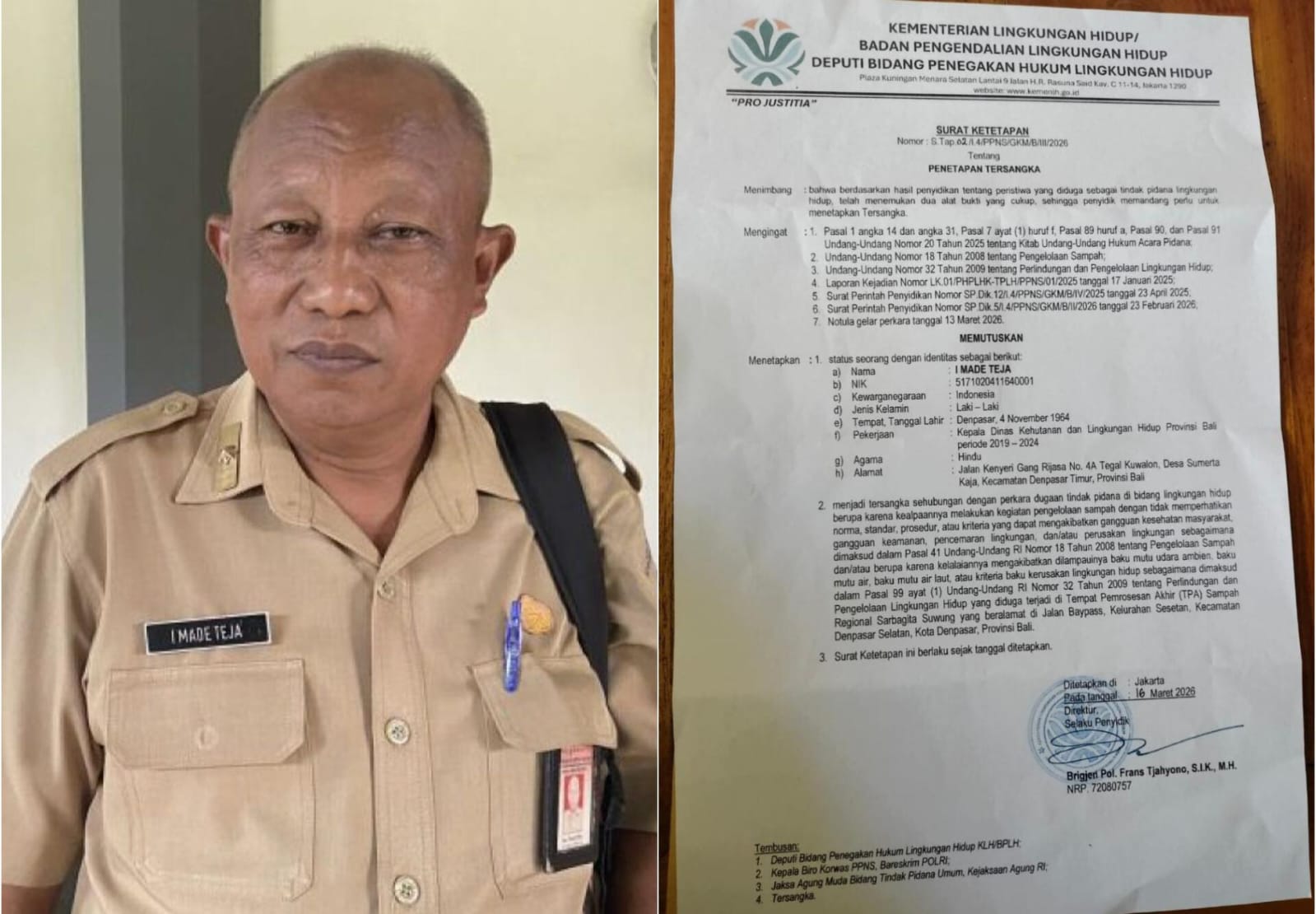 BALITOPIK.COM, DENPASAR – Kementerian Lingkungan Hidup dan Badan Pengendalian Lingkungan Hidup resmi menetapkan mantan Kepala Dinas Kehutanan dan Lingkungan Hidup (KLH) Provinsi Bali Periode 2019-2024 I Made Teja, sebagai tersangka dalam kasus dugaan tindak pidana lingkungan hidup terkait pengelolaan sampah di Tempat Pemrosesan Akhir (TPA) Suwung.