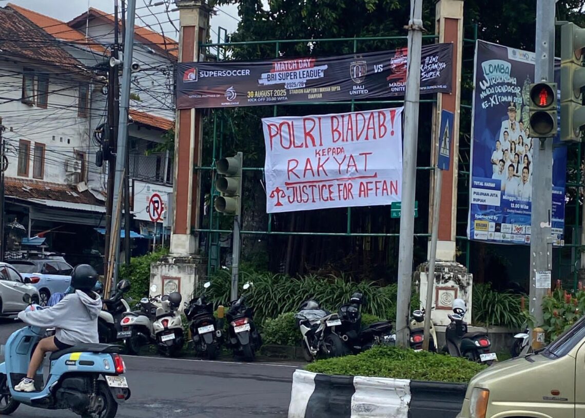 “Polri Biadab Kepada Rakyat, Justice For Affan,” begitu isi tulisan dalam salah satu spanduk di Jalan Sudirman–Panjer, Denpasar.